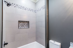 The comfortable master suite and bath boasts an abundance of amenities: custom soft close barn door, vaulted ceilings, two walk in closets, a large tiled shower with specially designed detail, a rain head shower, in-wall faucets, custom storage tower, vanity area and a pedestal tub. The guests bath were designed to be equally elegant with vessel sinks, specialty lighting and custom tile work.